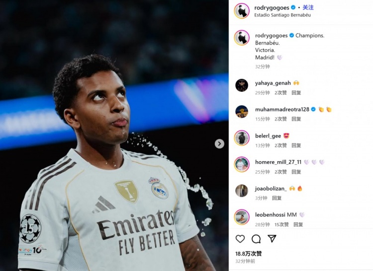 杆位造点!罗德里戈社媒庆祝:欧冠、伯纳乌、获胜 、马德里!
