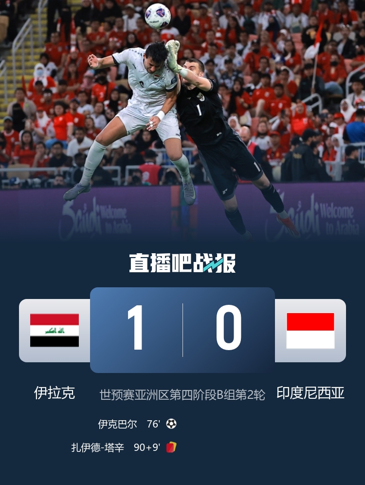 世预赛伊拉克2-0击败印尼,印尼两连败出局,伊拉克下轮对阵沙特。