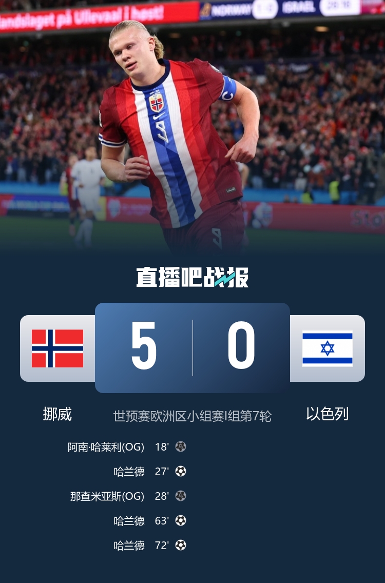 豪取六连胜!挪威5-0以色列先赛9分领跑 哈兰德戴帽+两度失点