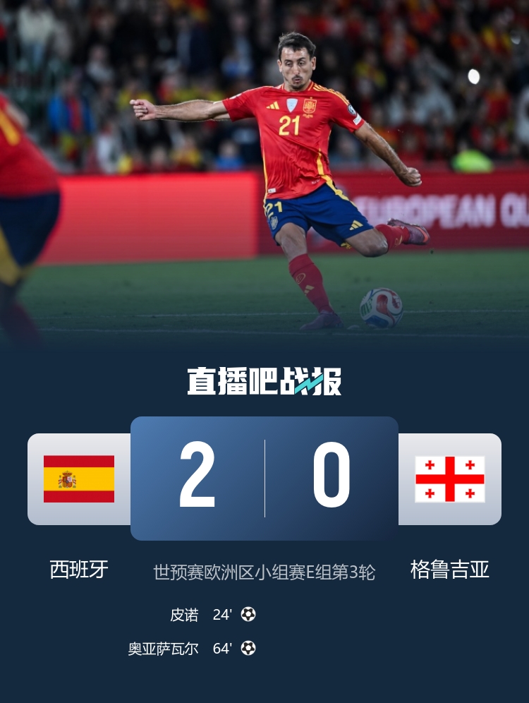 西班牙本轮2-0完胜格鲁吉亚,皮诺和奥亚萨瓦尔破门。