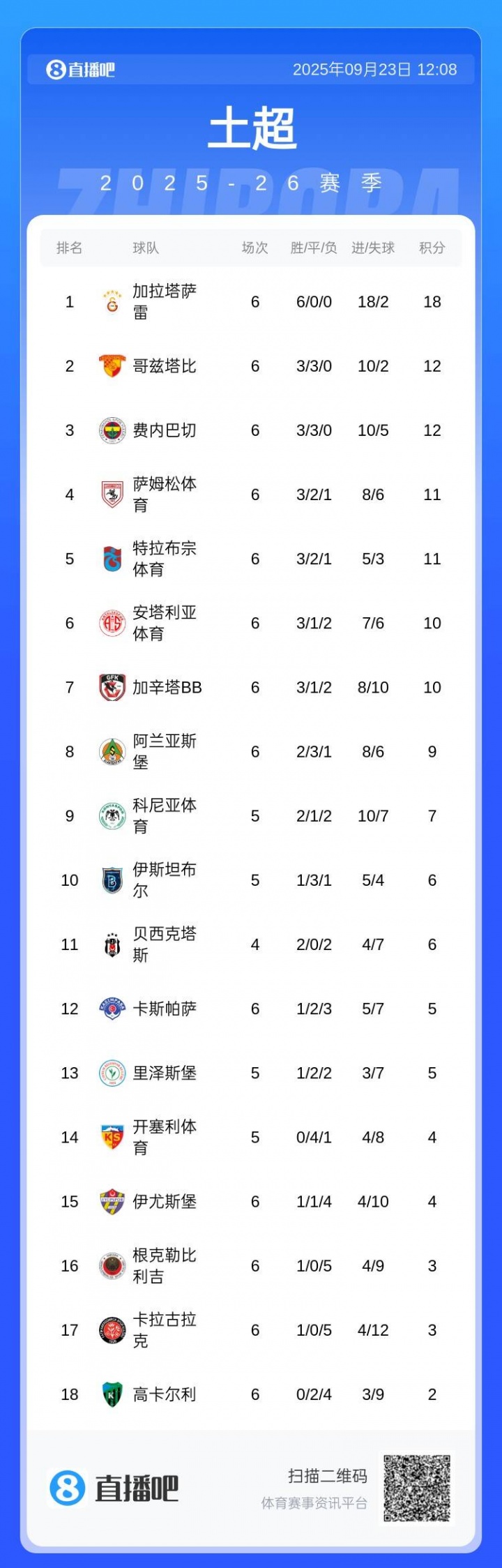 09月23日讯 土超第6轮赛事 ,费内巴切在半场就11打10的情况下1-1打平卡斯帕萨,加拉塔萨雷则是3-1击败科尼亚体育,继续全胜领跑土超。
