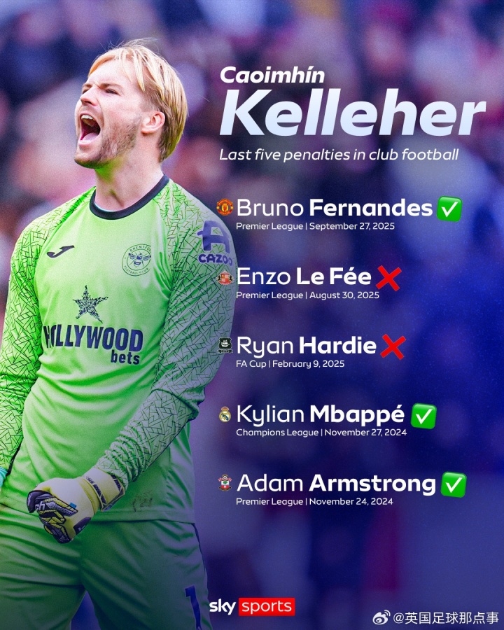 【扑点高手】Opta:凯莱赫效力于利物浦和布伦特福德期间,共面对7次十二码球(不包括罚球决胜 ),足球直播无插件免费在线观看其中扑出4次(57 %)。
