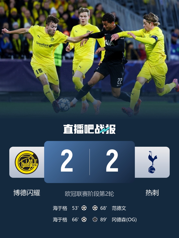 海于格个人秀双响,范德文破门,热刺造乌龙绝平。最终博德闪耀2-2热刺。