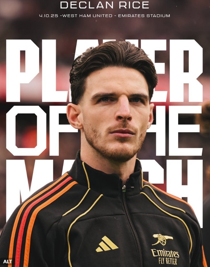 对旧主首开记录,阿森纳官方:赖斯当选战胜西汉姆队内最佳球员