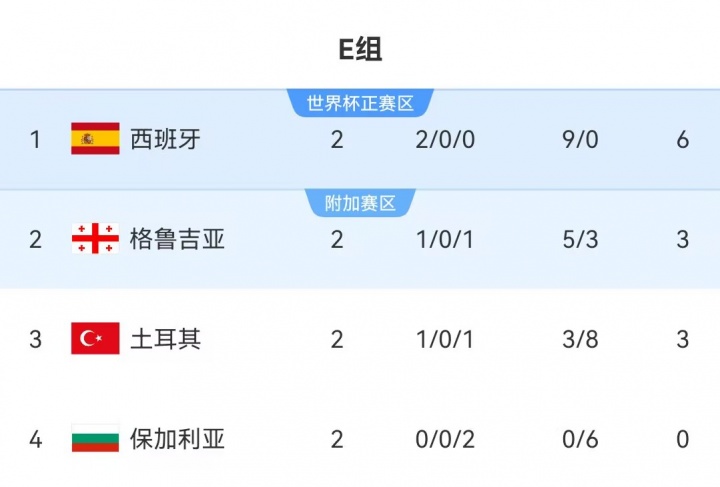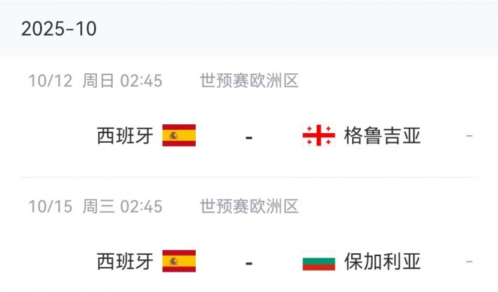 西班牙本月将进行两场世预赛欧洲区赛事 :10月12日主场作战 迎战格鲁吉亚,10月15日迎战保加利亚。目前西班牙在世预赛欧洲区E组2战全胜排名第1。