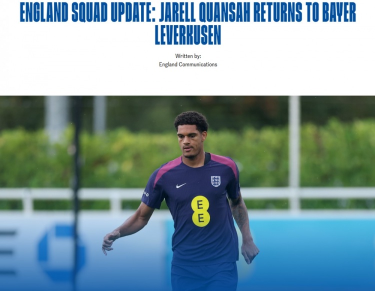 官方:宽萨因伤退赛英格兰队返回勒沃库森,球队暂无增补球员计划
