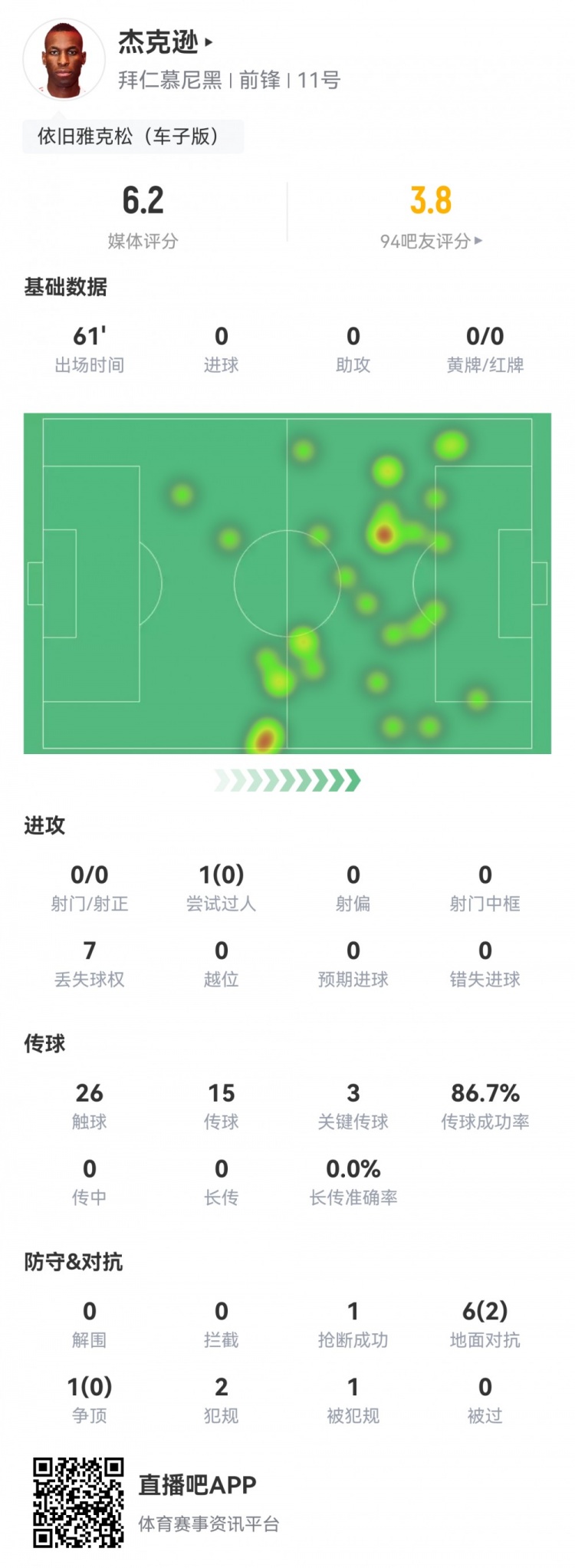杰克逊数据:0射球 ,3次关键传送球 ,7次丢失球权,评分仅6.2