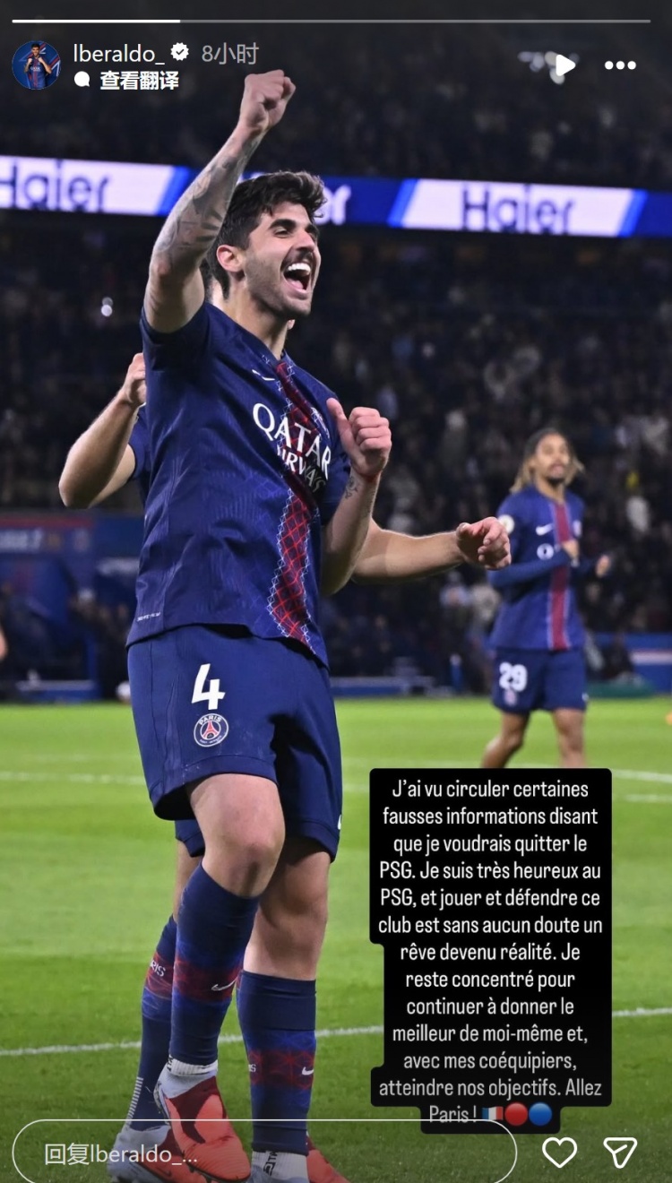 11月1日讯 巴黎后场球员贝拉尔多更新社媒动态,辟谣离队传闻。
