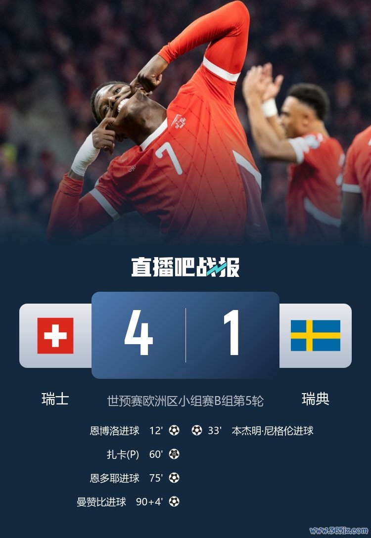 瑞士主场作战 4-1战胜瑞典,瑞士积13分位居榜首,领跑 第2名科索沃3分+11粒净胜球,瑞典5轮不胜继续垫底。