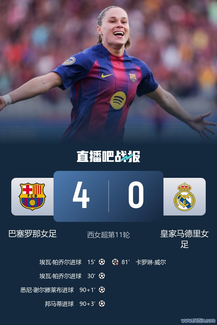 西女超-巴萨女足4-0皇马女足 帕乔尔双响邦马蒂后备 建功威尔失点